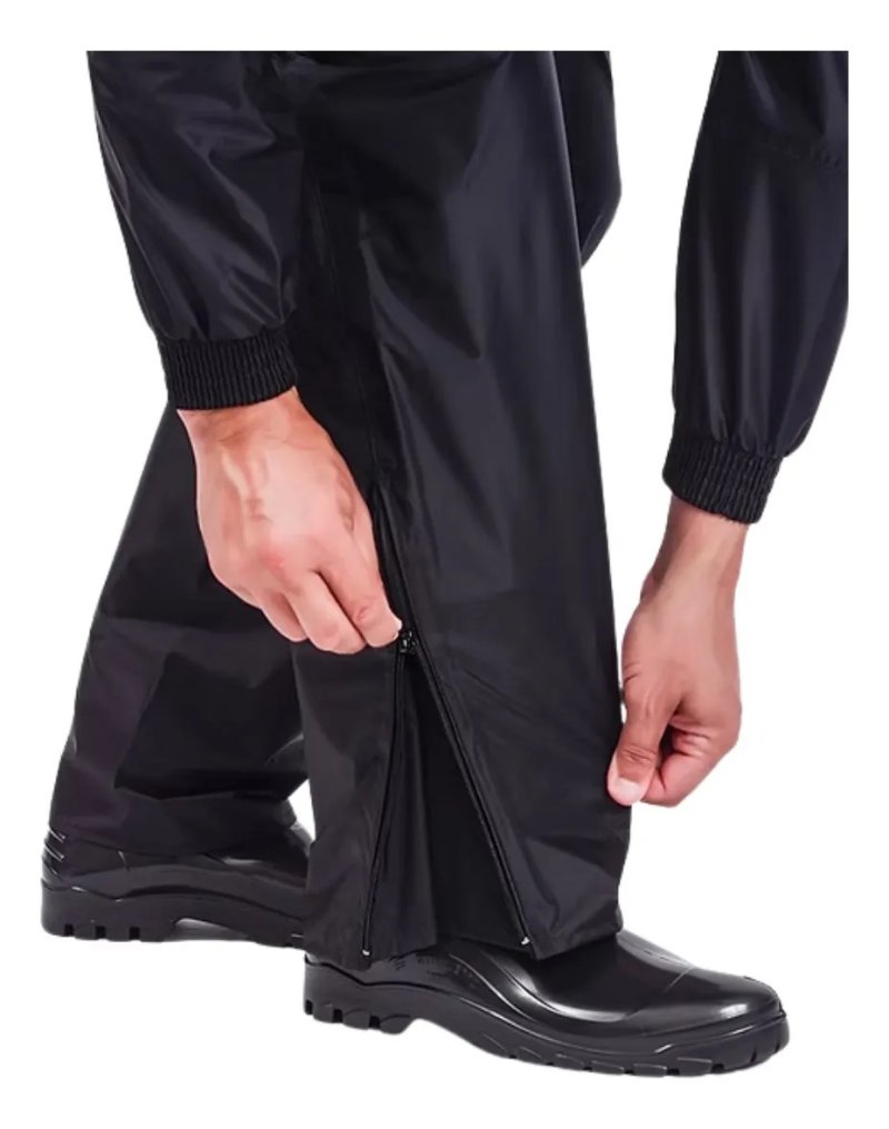 O tecido de Nylon emborrachado com uma face em poliamida e a outra em PVC fazem deste conjunto um produto reforçado. Além disso, a jaqueta e a calça são costuradas em maquina overloque de cinco fios, tornando a vestimenta extremamente resistente ao rasgamento. Todas as costuras são impermeabilizadas internamente por um processo especial de selagem térmica. A vestimenta é composta de jaqueta e calça, a jaqueta possui gola alta que permite um perfeito encaixe com o capacete impedindo a entrada de água, além da gola alta esse modelo possui capuz embutido na gola com abertura em zíper e bolso interno. Fechamento frontal duplo, através de zíper e duas lapelas com velcro que vão da cintura até o final da gola, punhos com regulagem dupla (elástico e velcro) e cintura da jaqueta com regulagem por elástico. A calça possui regulagem na cintura através de elástico e cordão e a barra das pernas com abertura através de ziper. Esse modelo pode ser confeccionado com faixas refletivas de 50 mm. As faixas refletivas utilizadas atendem a NBR 15292 (Vestimentas de Segurança de Alta Visibilidade). Conjunto de moto fornecido em sacola especial, confeccionada em nylon emborrachado e abertura superior em ziper.