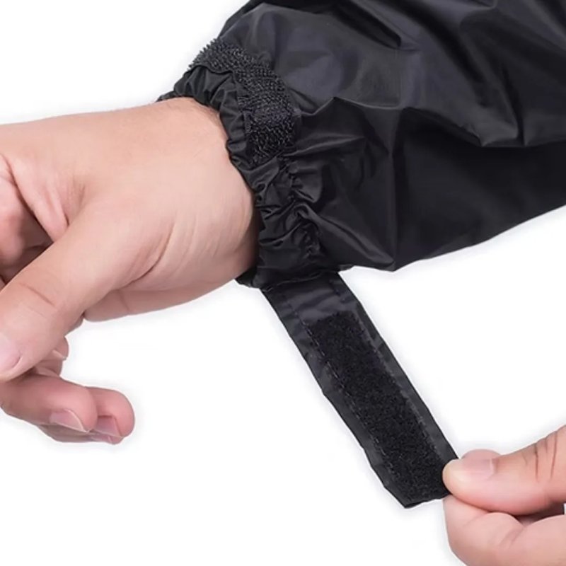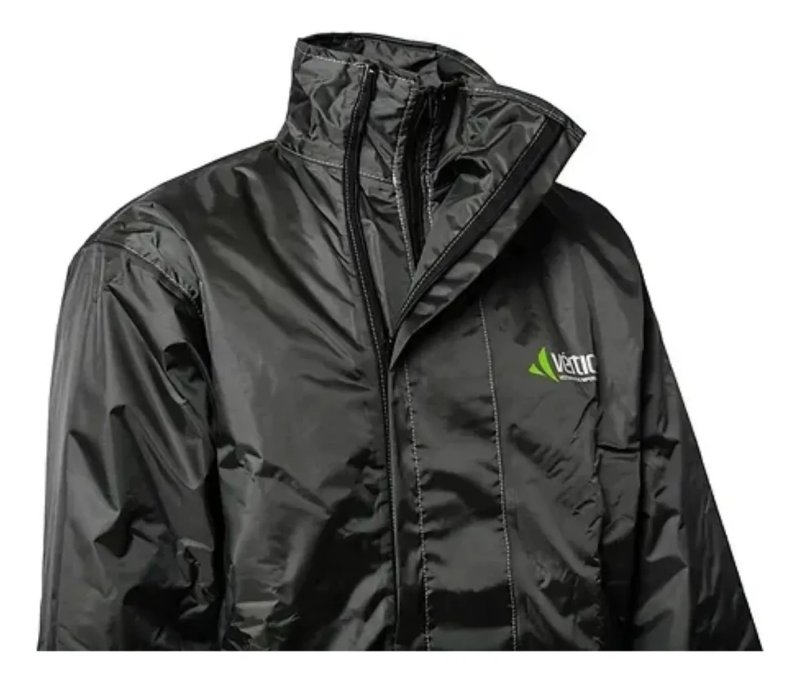 O tecido de Nylon emborrachado com uma face em poliamida e a outra em PVC fazem deste conjunto um produto reforçado. Além disso, a jaqueta e a calça são costuradas em maquina overloque de cinco fios, tornando a vestimenta extremamente resistente ao rasgamento. Todas as costuras são impermeabilizadas internamente por um processo especial de selagem térmica. A vestimenta é composta de jaqueta e calça, a jaqueta possui gola alta que permite um perfeito encaixe com o capacete impedindo a entrada de água, além da gola alta esse modelo possui capuz embutido na gola com abertura em zíper e bolso interno. Fechamento frontal duplo, através de zíper e duas lapelas com velcro que vão da cintura até o final da gola, punhos com regulagem dupla (elástico e velcro) e cintura da jaqueta com regulagem por elástico. A calça possui regulagem na cintura através de elástico e cordão e a barra das pernas com abertura através de ziper. Esse modelo pode ser confeccionado com faixas refletivas de 50 mm. As faixas refletivas utilizadas atendem a NBR 15292 (Vestimentas de Segurança de Alta Visibilidade). Conjunto de moto fornecido em sacola especial, confeccionada em nylon emborrachado e abertura superior em ziper.
