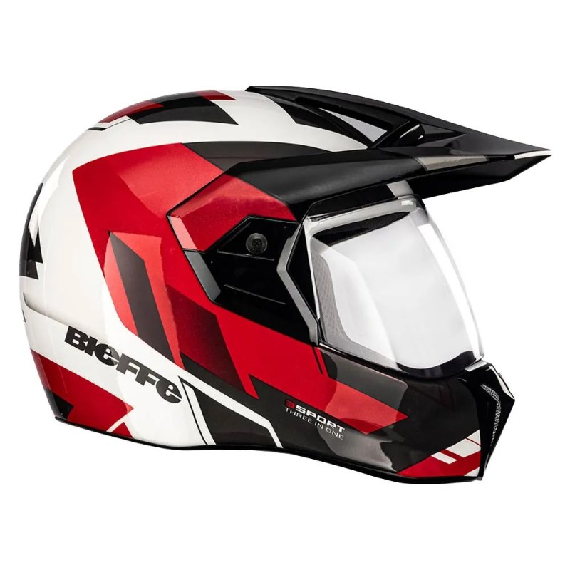 O 3Sport da Bieffe é um modelo único: você pode utilizá-lo de 3 maneiras diferentes: - Versão enduro: com pala e viseira; - Versão street: sem pala e com viseira; - Versão cross: com pala e sem viseira. Com ou sem viseira, um dos itens mais queridos pelos fãs de 3Sport é a pala. Seja para andar na cidade ou no on/off road, esse acessório deixa claro o estilo do motociclista. Esse é o clássico e famoso Bieffão!